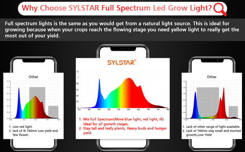 - 【REAL FULL SPECTRUM】The real Sunlight Full Spectrum tailored for indoor plant growth, (380nm-800nm, 3000K, 5000K) Blue, White, Red (660-665nm) and IR (IR 760nm), provide plants desired every spectrum in the natural sunlight, to optimize a plant’s growth from seeds to harvest (propagation, germination, vegetation, and bloom), produce high yields for your plants