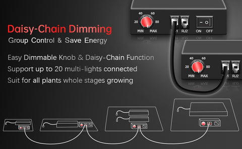 - 【Daisy Chain Functionality】 Keep your grow space clean and organized by reducing the clutter of power cables. Each LED has a 120V 1.5A power socket to allow multiple LEDs to be hooked together. The LED accepts the US standard C13 power cable and is supplied with the light.