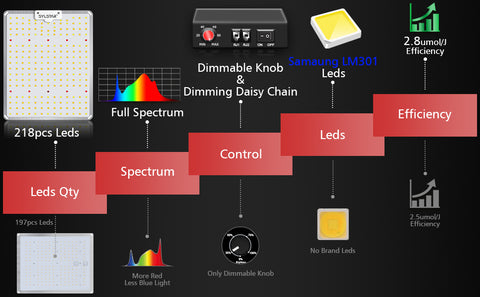 - 【SAMSUNG LM301d LED】The higher light intensity, less lumen depreciation, better lumens and Higher PAR values than ordinary LED chips. The Samsung LM301B is the highest light output and full-cycle LED for grow light at present, create more than 40% higher yields with less energy compared with other red blue LED lights.
