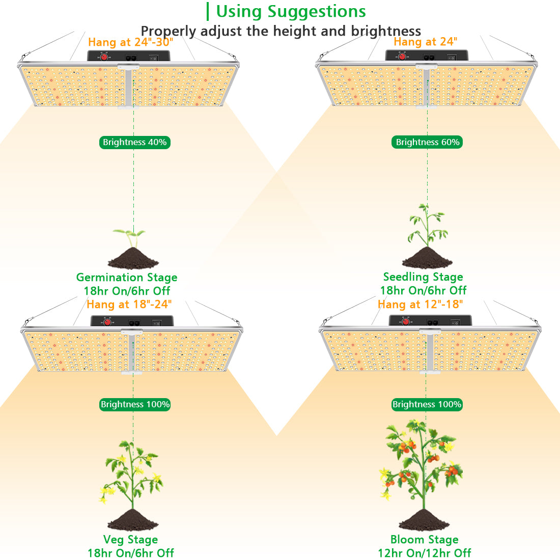 - 【HIGH EFFICIENCY】The high Energy Efficiency is up to 2.8 umol/J, only consume 220W, light output PAR/PPFD value is 1033umol/m²/s @ 12inch. Newest SMD LED panel grow light is designed to replace 315Watt CMH or 600Watt HPS, save more than 60% energy. Veg footprint is 3 x 4 ft, Flowering footprint is 2 x 4 ft.