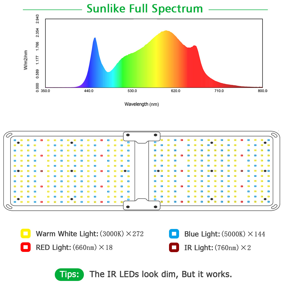 - 【REAL FULL SPECTRUM】The real Sunlight Full Spectrum tailored for indoor plant growth, (380nm-800nm, 3000K, 5000K) Blue, White, Red (660-665nm) and IR (IR 760nm), provide plants desired every spectrum in the natural sunlight, to optimize a plant’s growth from seeds to harvest (propagation, germination, vegetation, and bloom), produce high yields for your plants