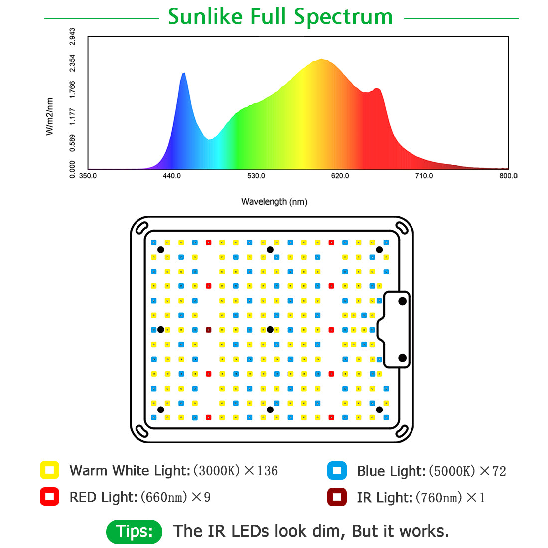 • 【REAL FULL SPECTRUM】The real Sunlight Full Spectrum tailored for indoor plant growth, (380nm-800nm, 3000K, 5000K) Blue, White, Red (660-665nm) and IR (IR 760nm), provide plants desired every spectrum in the natural sunlight, to optimize a plant’s growth from seeds to harvest (propagation, germination, vegetation, and bloom), produce high yields for your plants