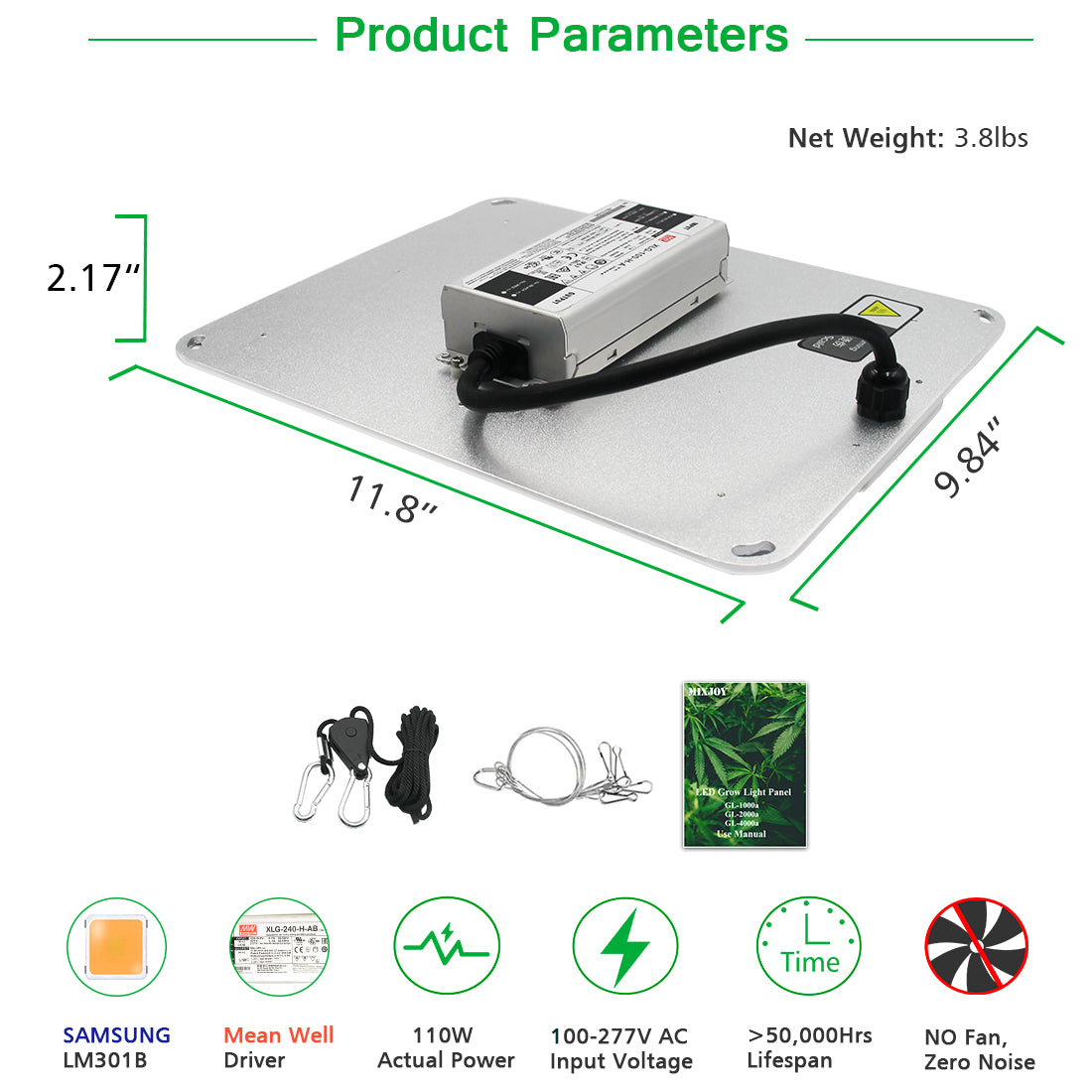 LED Grow Light GL1000 with Samsung LM301 Diodes & MeanWell Driver, 110W Sunlike Full Spectrum for Hydroponic Indoor Plants Veg&Flowering